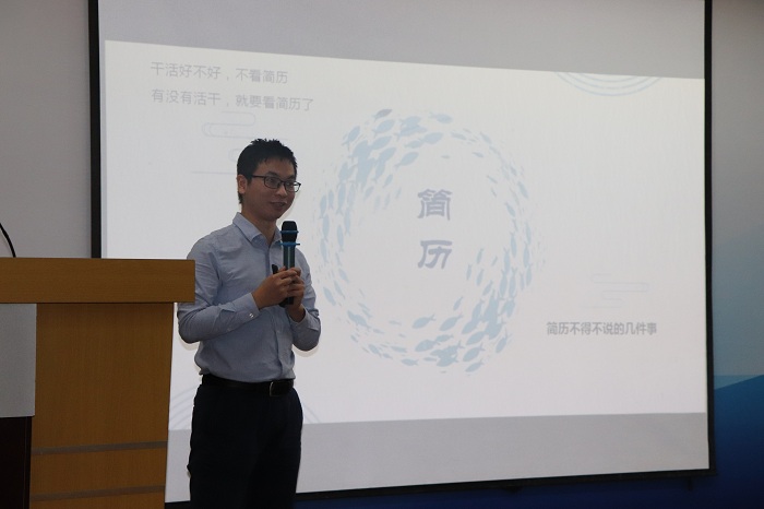 讲座围绕着“简历不得不说的几件事”这个主题,吴老师通过“简历原则”、“简历内容”、“简历准备”、“简历投递”四个方面向我们详细讲解了如何能更好的完成一份优秀的简历,强调了简历会影响求职者的求职结果的重要性。最后,还给同学们举了罗永浩简历的案例。