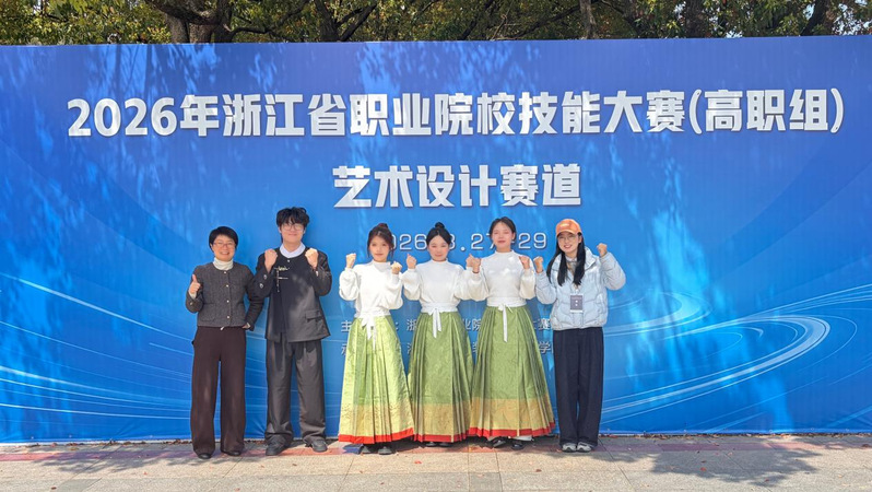 2026年3月30日,浙江省职业院校技能大赛(高职组)艺术设计赛道圆满落下帷幕。经过激烈角逐,由建筑与艺术学院李宇老师和邬琦姝老师指导的张冰青、濮安琪、姜楚煜、陈忆祖参赛团队,凭借扎实的专业素养与出色的创新能力,从全省近120支高职院校代表队中脱颖而出,荣获省级金奖。