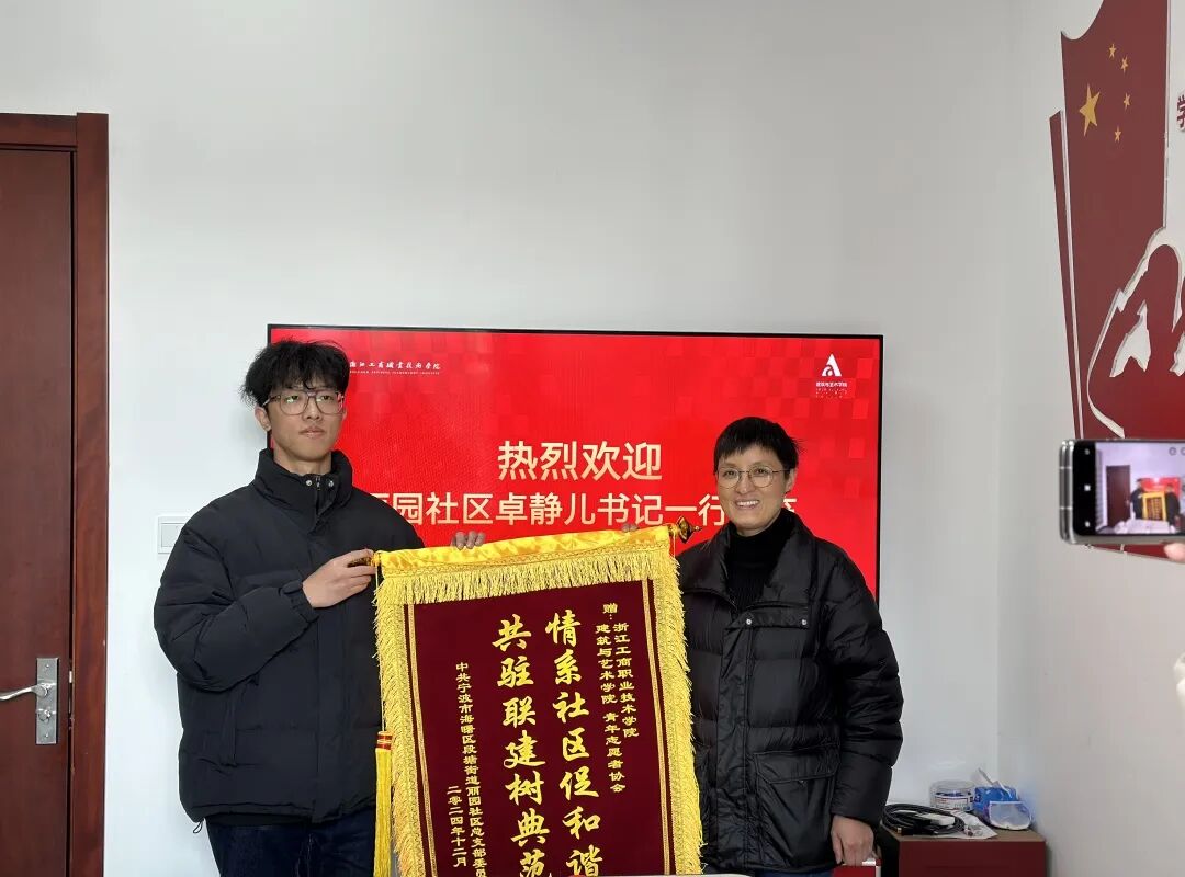 12月24日下午,段塘街道丽园社区卓静儿书记一行于来到建筑与艺术学院赠送锦旗,感谢学院在社区建设和志愿服务中作出的积极贡献。建筑与艺术学院党总支副书记丁佩芬老师、团总支书记周源彬老师,以及石红红老师,与卓书记一行进行了深入交流。