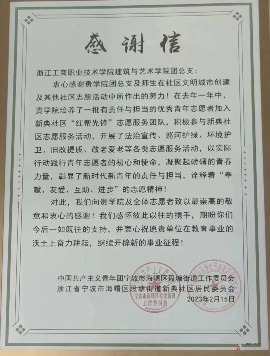同时,新典社区为感谢学院师生志愿者在文明城市创建中的帮助,特为学院团总支送来一封感谢信,由衷感谢我院的志愿者们感怀彼此的携手,并衷心祝愿学院的教育事业蒸蒸日上,继续开辟新的征程。