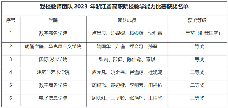浙江省教学能力比赛是省内覆盖最广、影响最大的高职院校教师教学竞赛,是浙江省职业教育打造“业务精良、充满活力”的高素质专业化教师队伍的重要支撑,也是浙江省职业院校展示教育教学与时俱进的重要平台。本次大赛吸引了来自全省48所高职院校310件参赛作品,经过专家网络初评、现场决赛,共评出一等奖32项,二等奖64项,三等奖93项,推荐14件作品参加2023年全国职业院校技能大赛教学能力比赛。
