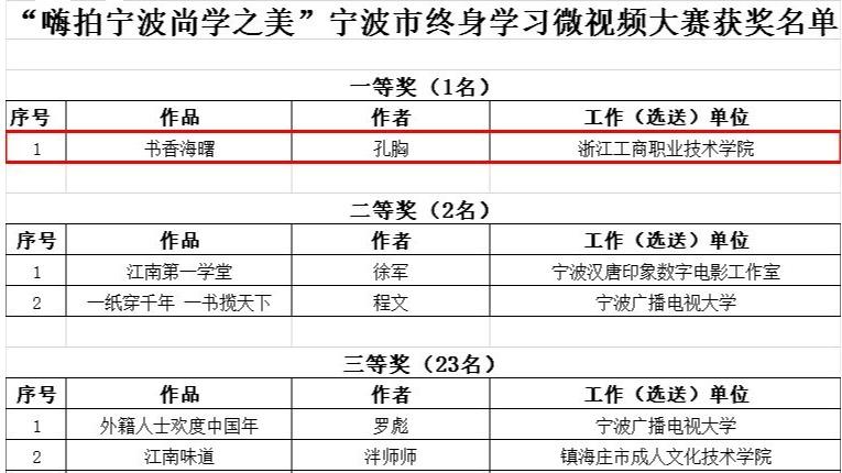 12月10日,宁波市教育局公布了“嗨拍宁波、尚学之美”宁波市全民终身学习微视频大赛获奖名单。真是一个令小商激动的时刻!我校推选的由我院教师孔庆康老师带领的小绵羊工作室作品《书香海曙》获得了唯一的一等奖!
